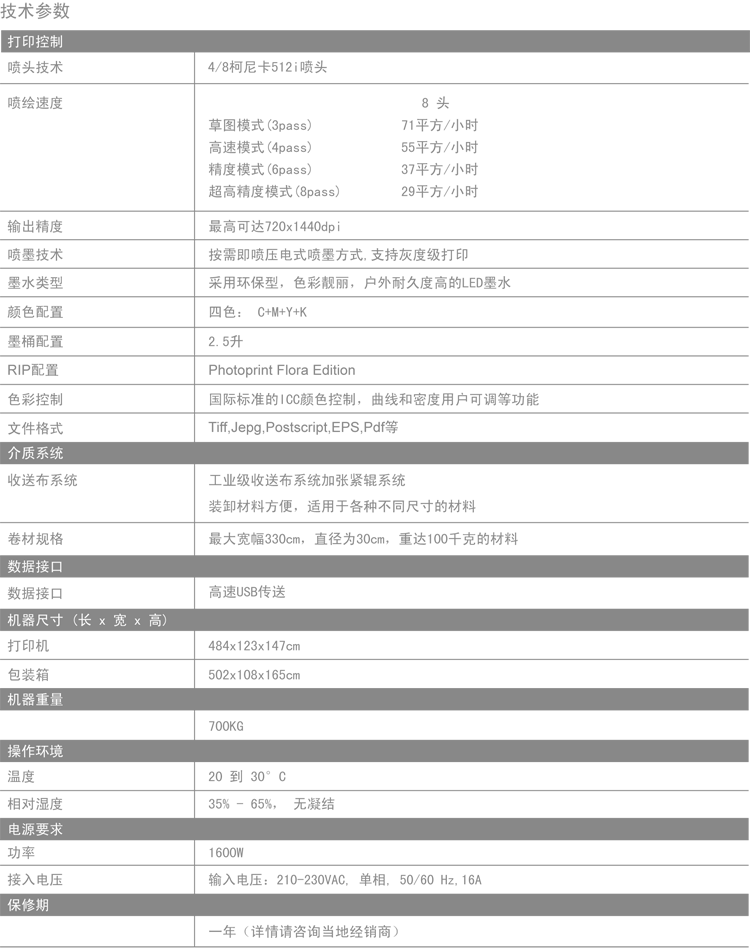 顏色:標(biāo)準(zhǔn)四色打印,支持四級灰度,采用柯尼卡512i噴頭/6pl,支持四級灰度,速度更快,飽和度更高,色彩鮮艷亮麗。噴頭維護(hù)更簡單,節(jié)省墨水。